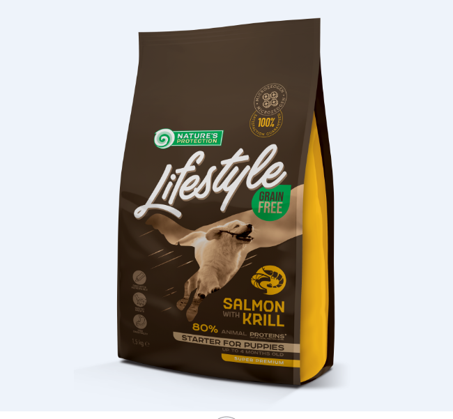 5. Nature's Protection Lifestyle Grain Free Salmon with Krill Juniors All Breeds Сухий беззерновий корм для юніорів усіх порід з лососем та крилем, 1,5 кг - беззерновий корм з лососем і крилем. Джерело омега-кислот і антиоксидантів, підходить собакам із чутливою шкірою чи алергією на зернові.
