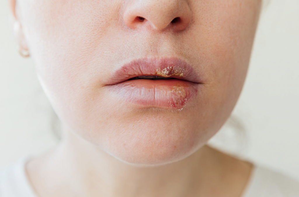 Герпес проявляється у вигляді висипань, які проходять кілька стадій розвитку. Спочатку виникає свербіж або печіння, далі з’являються дрібні пухирці з прозорим вмістом, які з часом розкриваються і покриваються кірками. Ураження можуть супроводжуватися болем і дискомфортом.