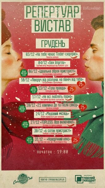 У грудні на сцені Caribbean Club — вистави театру «Чорний Квадрат», відомого своїм відвертим гумором і гострими сюжетами. У репертуарі — історії про стосунки, кохання, близькість і пошуки себе, подані в легкій, дотепній та впізнаваній манері театру.